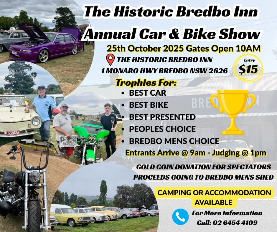 WHAT’S ON: Prizes available for Best Car, Best Bike, Best Presented, People’s Choice and Bredbo Men’s Choice.