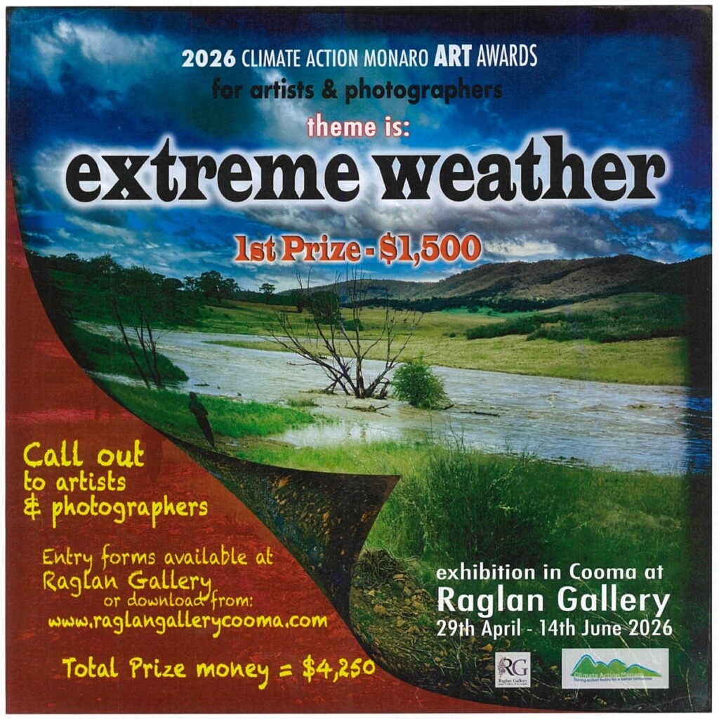 WHAT’S ON: The 2026 Climate Action Monaro Art Awards invite artists and photographers to submit entries with the theme: Extreme Weather. There is a prize pool of $4250 with first prize of $1500. Entry forms available at Raglan Gallery or download from www.raglangallerycooma.com