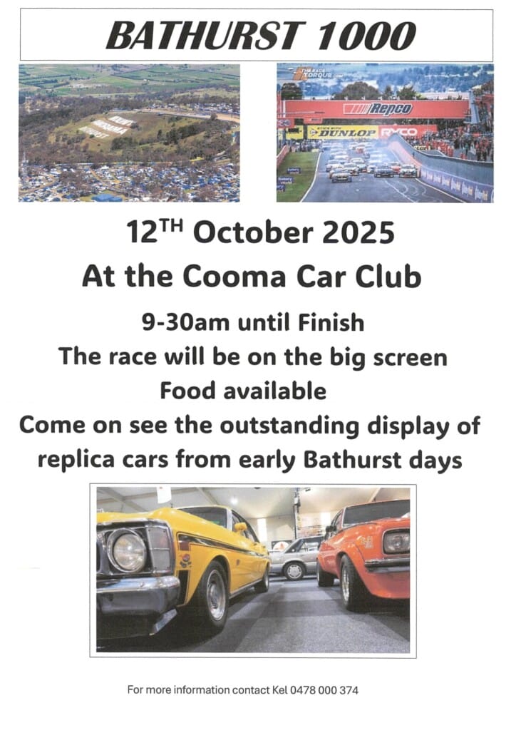 WHAT’S ON: Come along and watch the race on the big screen with some like-minded car racing enthusiasts. There will be food available and a range of replica cars from the early Bathurst days.