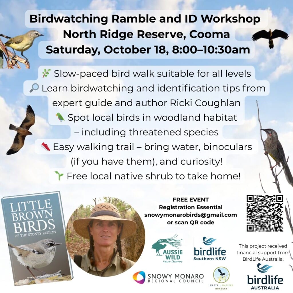 WHAT’S ON: ‘Join us for a relaxed morning of birdwatching in the beautiful woodlands of North Ridge Reserve, led by author and bird guide Ricki Coughlan. This free workshop is perfect for beginners and seasoned birders alike. You’ll learn how to observe and identify local birds — including some of our region’s threatened species — in their natural habitat.’