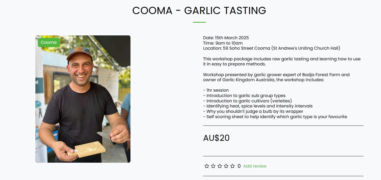 Workshop presented by garlic grower expert of Badja Forest Farm and owner of Garlic Kingdom Australia, the workshop includes: – 1hr session – Introduction to garlic sub group types – Introduction to garlic cultivars (varieties) – Identifying heat, spice levels and intensity intervals – Why you shouldn’t judge a bulb by its wrapper – Self scoring sheet to help identify which garlic type is your favourite