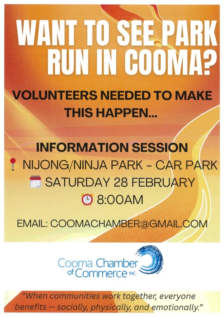 WHAT’S ON: Come along to find out more about the plans for a park run in Cooma. Volunteers needed.