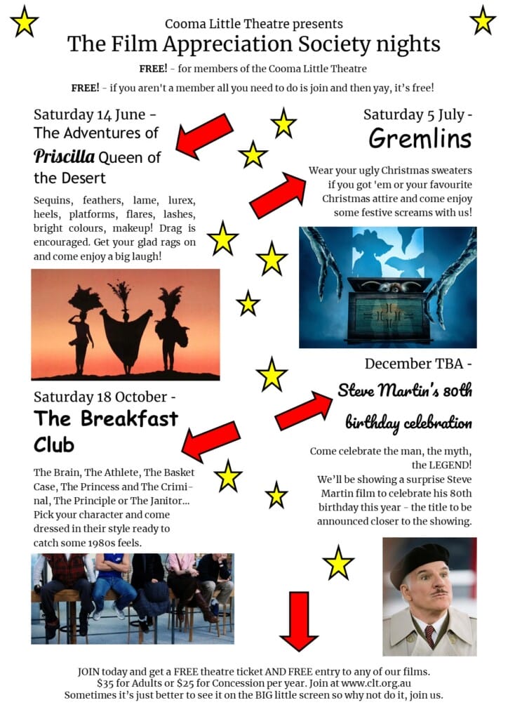If you’re not a member of Cooma Little Theatre, join today and attend all film nights FREE! Become a member at www.clt.org.au and join in the fun!