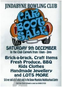 / Cooma Visitors Centre – Jindabyne Bowling Club Car Boot Sale 9th Dec 2017