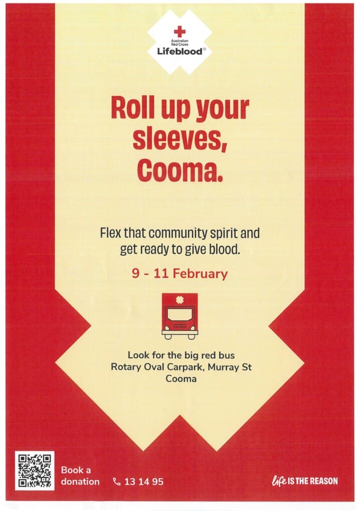 WHAT’S ON: Got a bit of time in February? Time to give blood and change lives? 1 in 3 people in Cooma will need blood, and they need people like you to give it. We’re rolling into town from 9–11 February. Don’t forget to pre-book your spot at lifeblood.com.au, on our app or on 13 14 95.