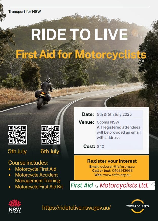 Two fully accredited Motorcycle First Aid courses will be held in the Cooma area on the weekend of the 5 and 6 July 2025.