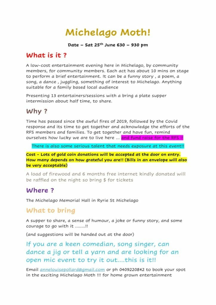 Email annelouisepollard@gmail.com or ph 0409220842 to book your spot in the exciting Michelago Moth !!! for homegrown entertainment