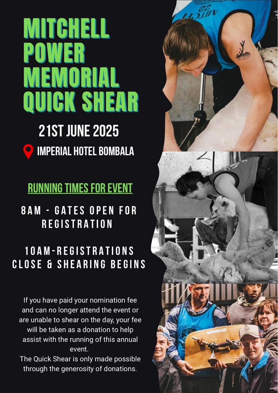 Head to the Imperial Hotel Bombala for the Mitchell Power Memorial Quick Shear on 21 June.