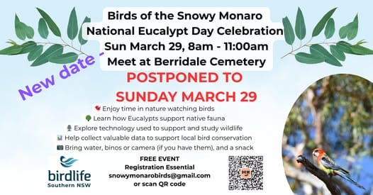 COST: FREE but registration essential by email at snowymonarobirds@gmail.com or scan QR code below.
