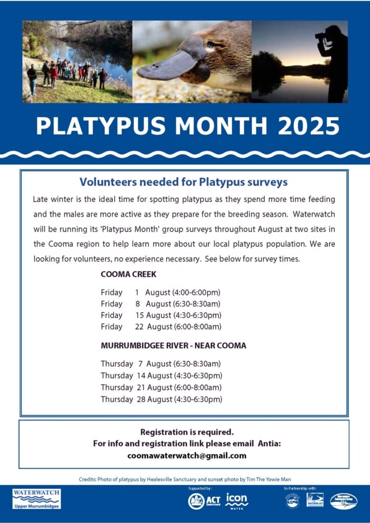 WHAT’S ON: Volunteers for spotting platypus wanted around Cooma.