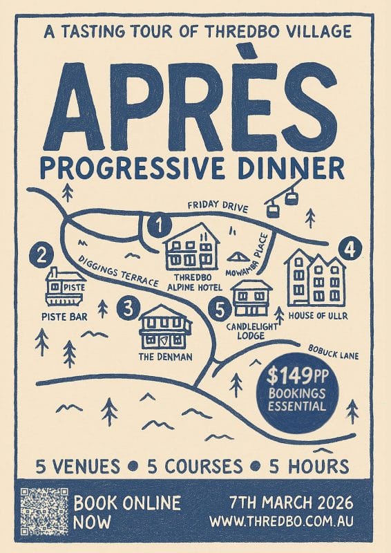 WHAT’S ON: Join us on a tasting tour of Thredbo Village with our Progressive Après Party, a celebration of alpine energy, great company and unforgettable flavours. Across the afternoon, you’ll make your way through five of Thredbo’s most iconic venues: Cascades Restaurant, Piste Bar, The Denman, House of Ullr and Candlelight Lodge.