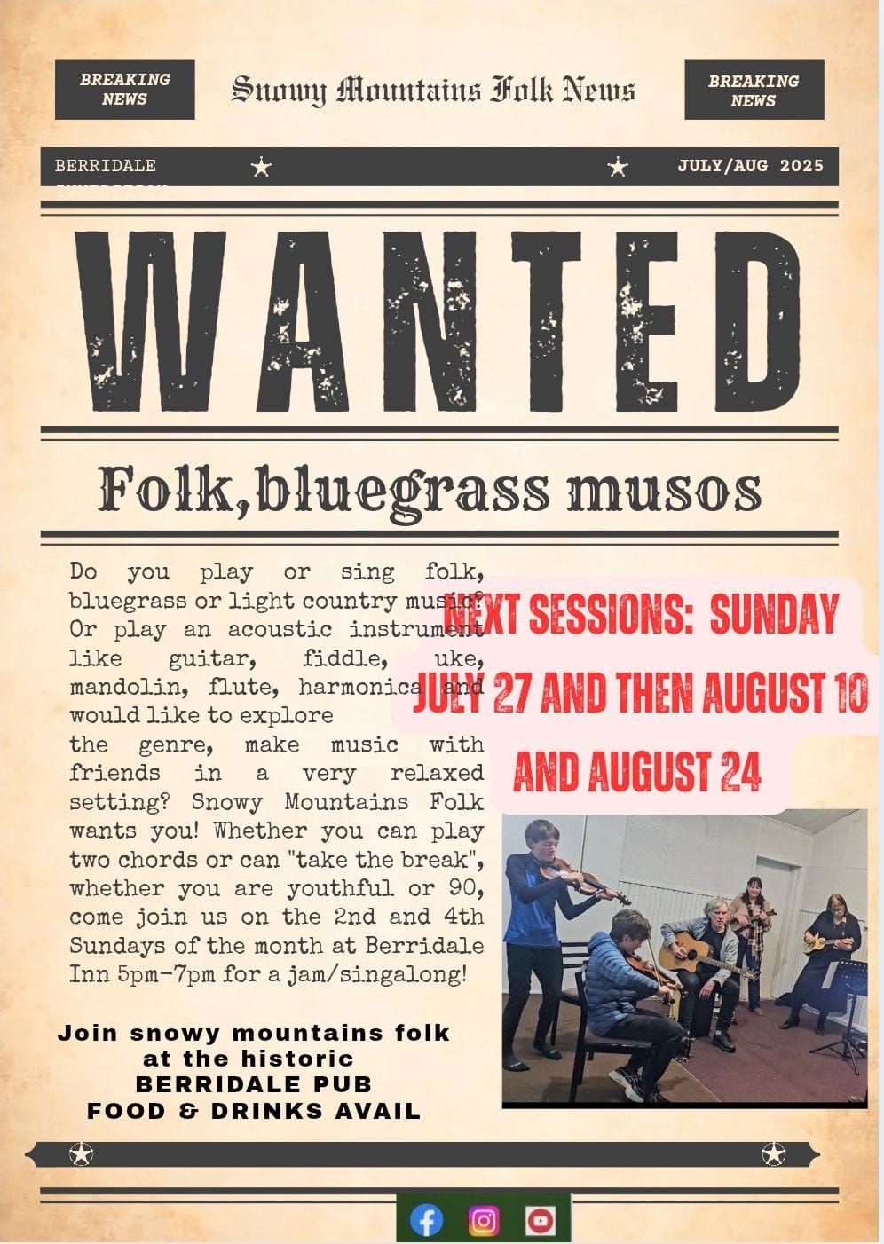 WHAT’S ON: Friendly fortnightly folk, light country, bluegrass open jam session for all ages and levels of musician. For further information, call the number on the image below or click here