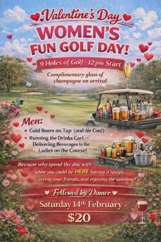 WHAT’S ON: 9 holes of golf starting from 12pm for the ladies only. Men to run the drinks cart out to the thirsty golfers. All followed by dinner.